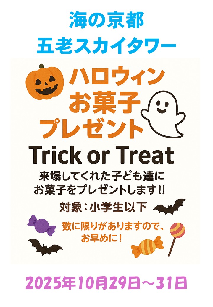 トップページ» お知らせ » 【イベント情報(10/29日~10/31日)】ハロウィン企画「五老スカイタワーにご来場頂いた子供達にお菓子プレゼント!!